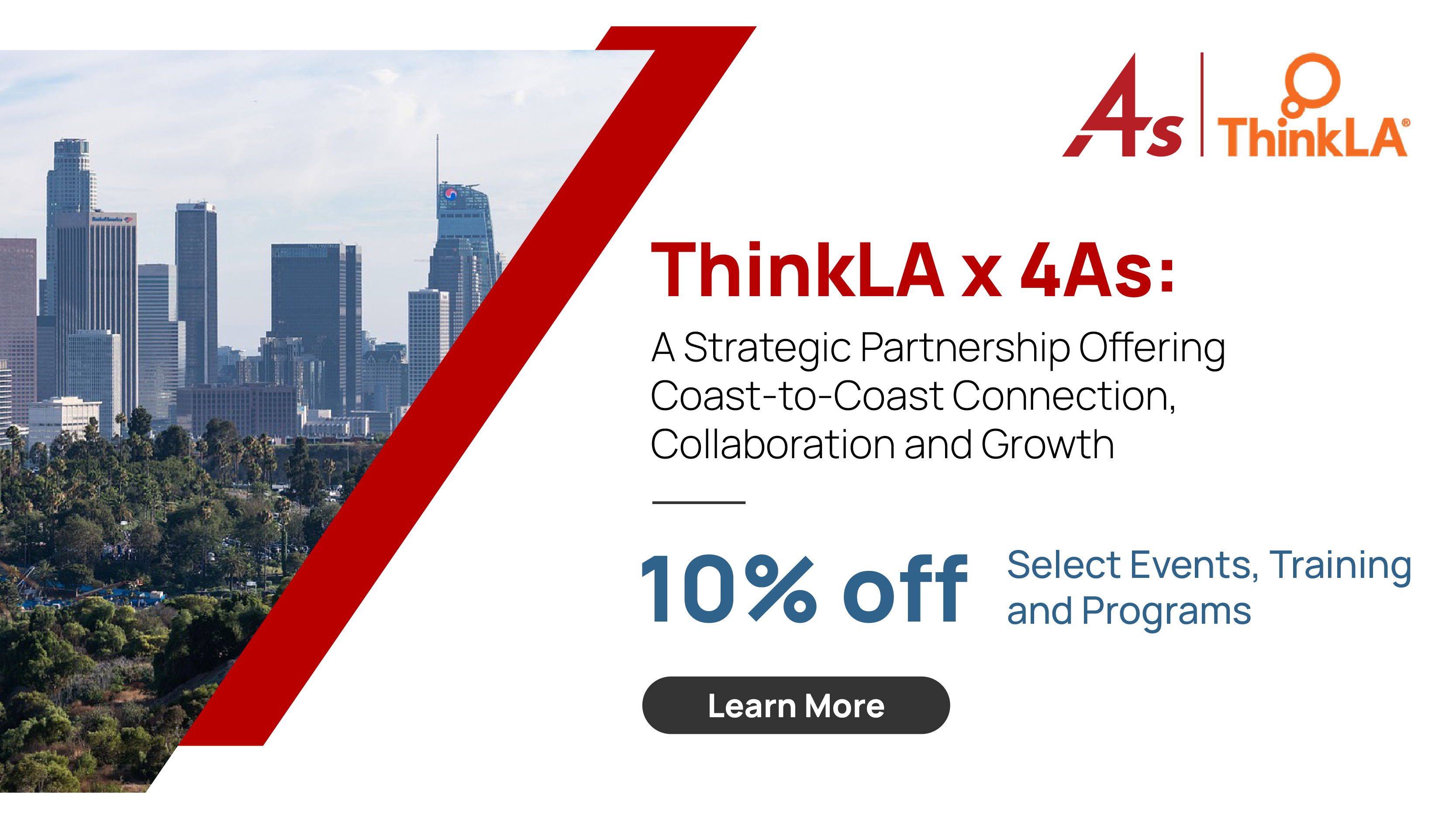 If you're a ThinkLA corporate member AND a 4As member, you’ll receive an additional 10% off the selected events on top of your standard discount. It’s our way of saying thanks for being part of both communities.