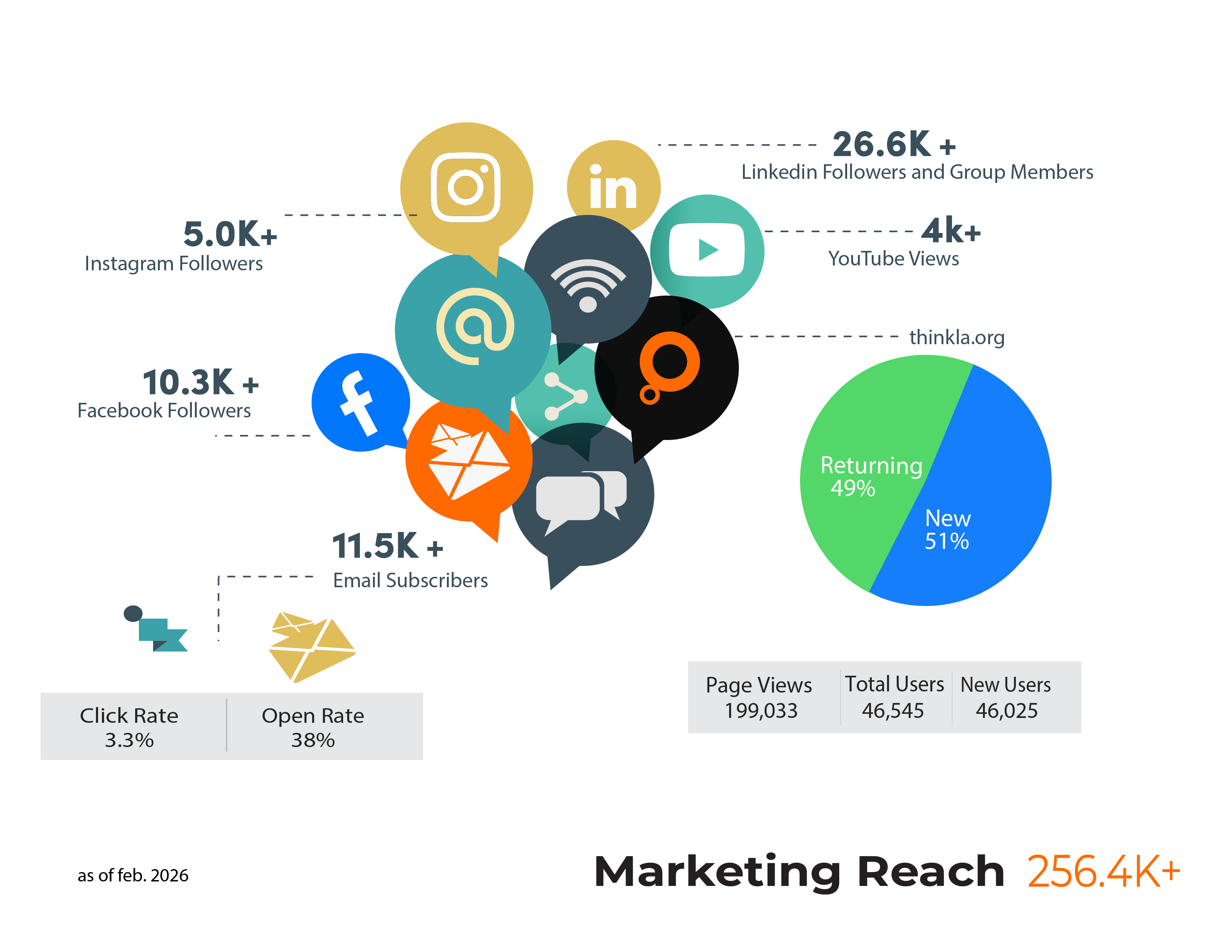 ThinkLA is the largest regional advertising, media, and marketing association in the country, with over 30,000 followers on our digital platforms, 17,000+ website visitors, and 11,000+ opt-in email subscribers.